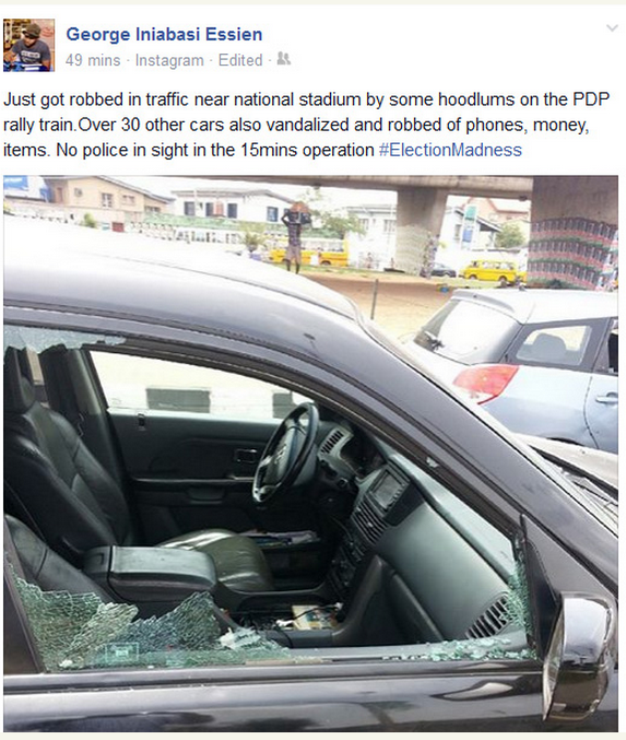 This sensitization march however turned violent as thugs who support the PDP vandalized vehicles and robbed ย occupants of Phones, Money and other Items.