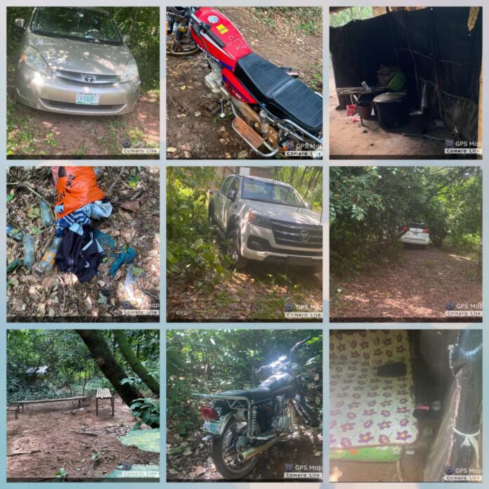 Upon clearing the scene, operatives recovered a number of stolen and suspicious items, including an ash-coloured Toyota Sienna with registration number EKY 03 FF, an unregistered white Mazda Hilux, one motorcycle, and various household and personal effects such as mattresses, cooking utensils, groceries, gallons, mechanical tools, and clothing materials. These discoveries suggest the camp was not only a criminal hub but also served as a temporary residence for the occupants.