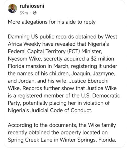 Fresh controversy has erupted around Nigeria’s Minister of the Federal Capital Territory (FCT), Nyesom Wike, following revelations that he allegedly acquired a $2 million mansion in Florida, United States, under the names of his immediate family members. The damning details, uncovered through U.S. public records and published by West Africa Weekly, have sparked widespread public concern and calls for accountability.