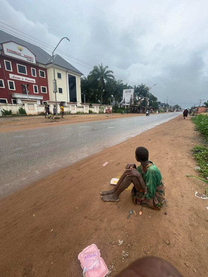 The woman, whose identity still remains unknown as at the time of filing this report, has reportedly been living for weeks along Old Onitsha Road in Nnewi, directly opposite the Premium Kidney Hospital. Videos and pictures of her condition, now trending on social media, show her sitting and looking helplessly after having taken her meal by the busy roadside, fully exposed to the scorching sun and heavy downpours.