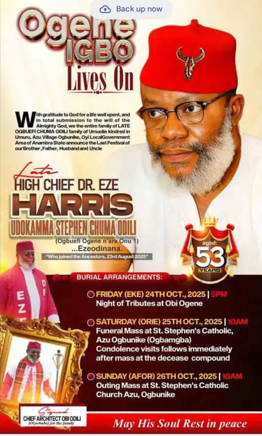 The family of the late Anambra-born journalist, media consultant, and cultural ambassador, High Chief Dr. Eze Harris Udokamma Stephen Chuma-Odili, popularly known as Ogene Ogbunike or Eze Odinana, has officially announced his burial arrangements.