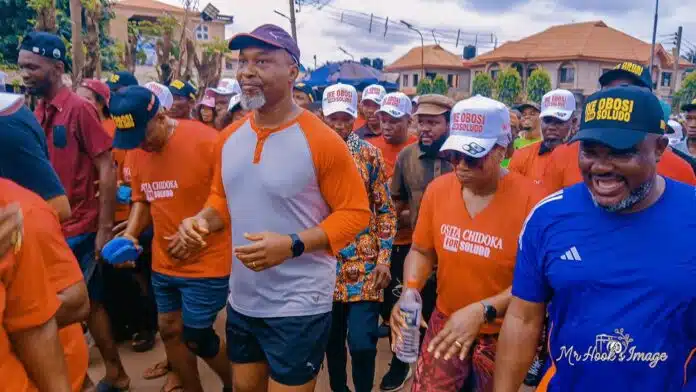 It was a full fledged support for Governor Chukwuma Soludo’s re-election bid as former Minister of Aviation, Chief Osita Chidoka, his wife, Barrister Chidinma and his younger brother, Hon. Obinna Chidoka who represented Idemili North/South Constituency in the House of Representatives led other stakeholders and the entire Obosi electorate in a road show to demonstrate their unalloyed support for Soludo.