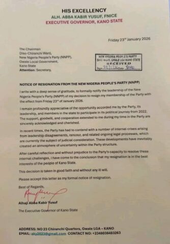 _KANO, Nigeria – Governor *Abba Kabir Yusuf* of Kano State has formally submitted his resignation from the New Nigeria People’s Party (NNPP) through a written letter addressed to the party’s Diso‑Chiranchi Ward chairman, Gwale Local Government Area. The letter, dated *January 25, 2026* (with some reports indicating an effective date of *Friday, January 23, 2026*), states:
