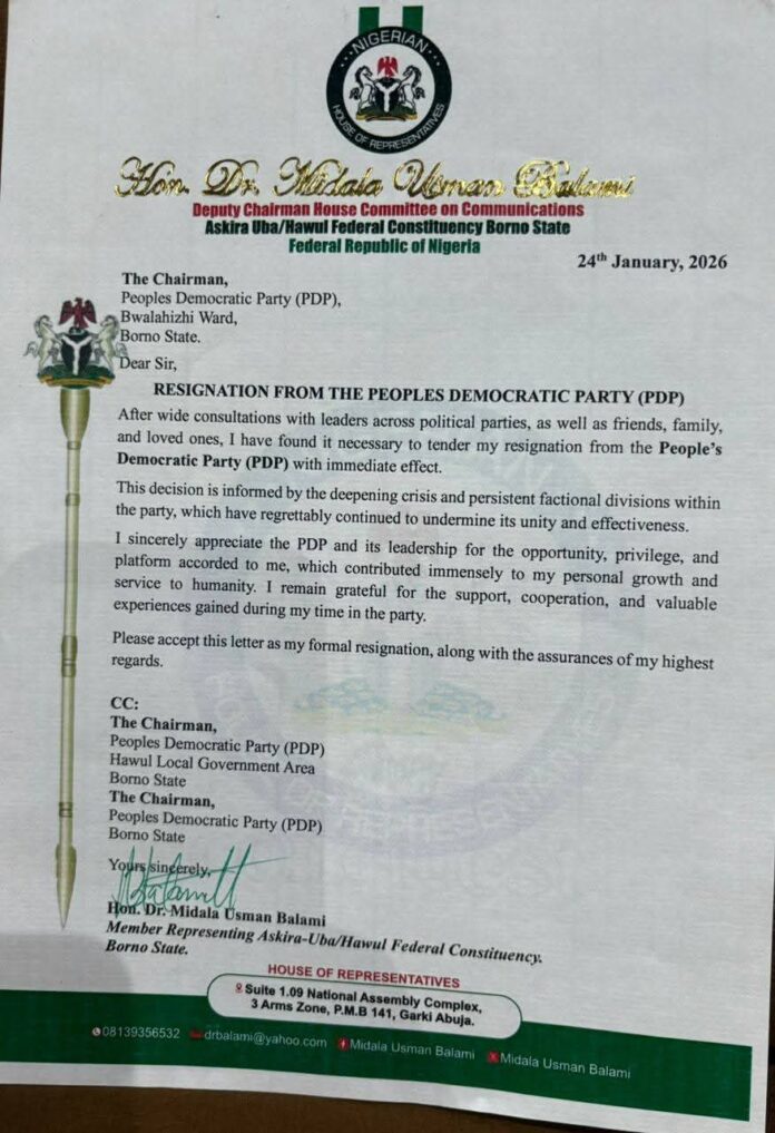 A member of the House of Representatives, Hon. Dr. Midala Usman Balami, has formally resigned from the Peoples Democratic Party (PDP), citing persistent internal crises and factional divisions within the party.