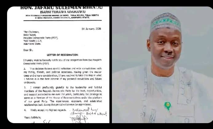 The resignation, dated 8th January 2026, was conveyed in a letter addressed to the PDP Chairman of Bako Ward in Yola South Local Government Area. In the letter, Hon. Ribadu announced his decision to withdraw from the party after what he described as careful reflection and extensive consultations with associates and stakeholders.