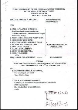 The Form 48, served by Maxim Law Firm at Anyanwu’s residence in Wuye and the INEC headquarters in Maitama, serves as a final warning. It directs the parties to “cease further disobedience” or face committal to prison for contempt of court.