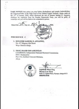 As of press time, neither Senator Anyanwu nor the INEC Chairman has issued an official response to the notice.