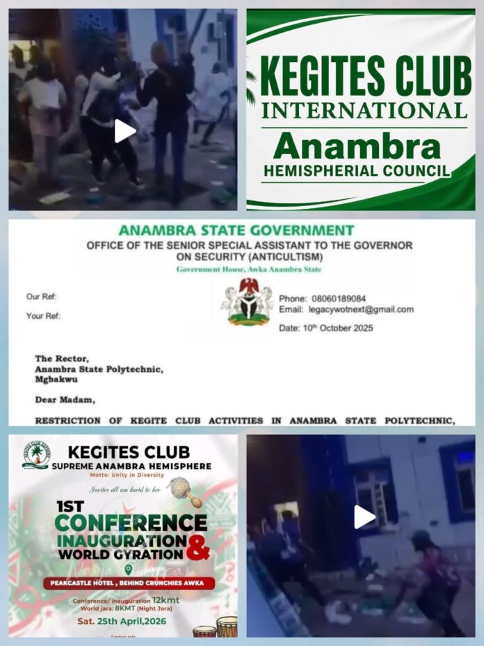 In one of the restriction letters, addressed to the Provost of the Anambra State Polytechnic, Mgbakwu, and dated October 10, 2025, the then Senior Special Assistant to the Governor (SSA) on Security and Anticultism, Hon. Kingsley Ezika, wrote: “I am writing to bring to your attention, a pressing concern regarding Kegite Club activities in Anambra State Polytechnic, Mgbakwu. As you are aware, the Anambra State Government has enacted the Anambra State Homeland Security Law 2025, prohibiting unauthorized groups and cultism.