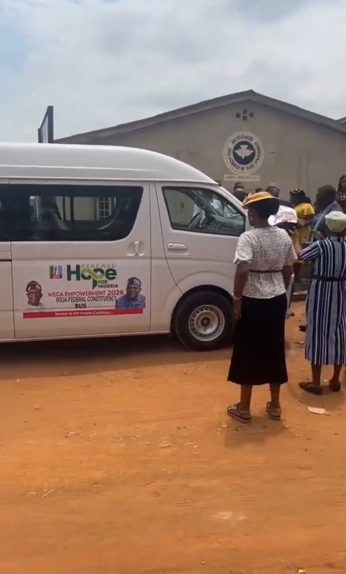 In the footage, which went viral on Monday, April 6, 2026, congregants are seen surrounding the white bus on church grounds, praying fervently for its future use. The vehicle, clearly branded with President Bola Ahmed Tinubu’s campaign slogan, was brought to the sanctuary by a lucky beneficiary of a recent government empowerment programme.