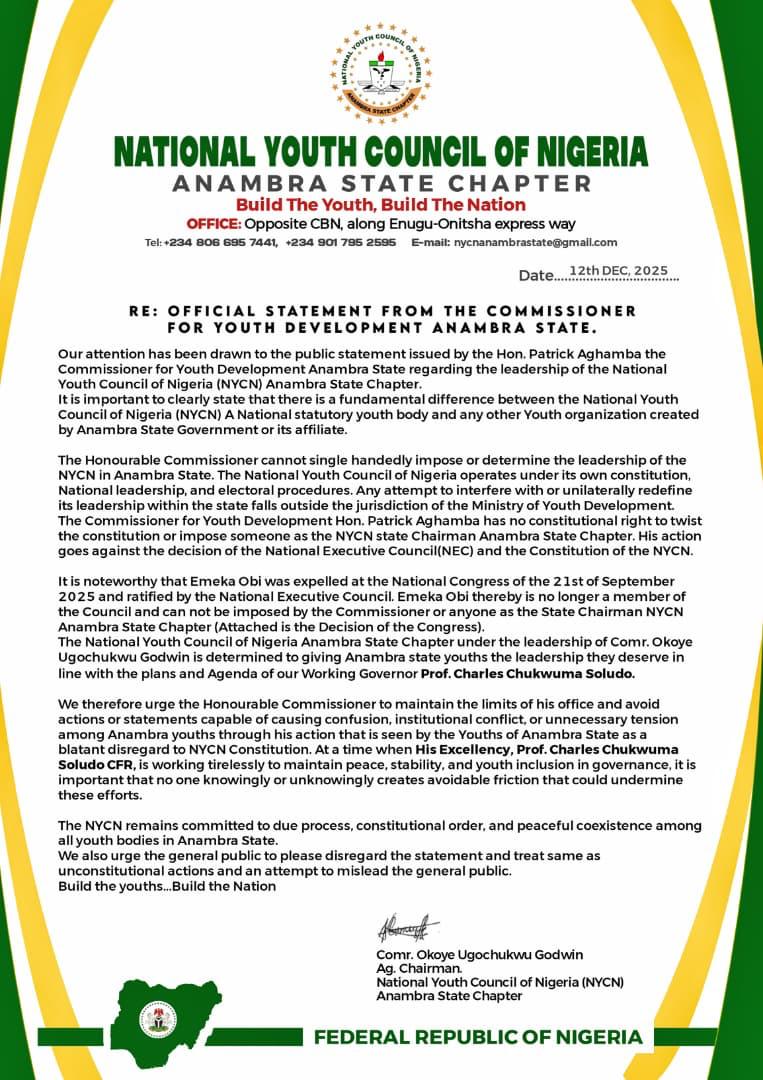 NYCN Anambra Counters Commissioner Agha Mba’s Statement, Reaffirms Okoye as Authentic Chairman